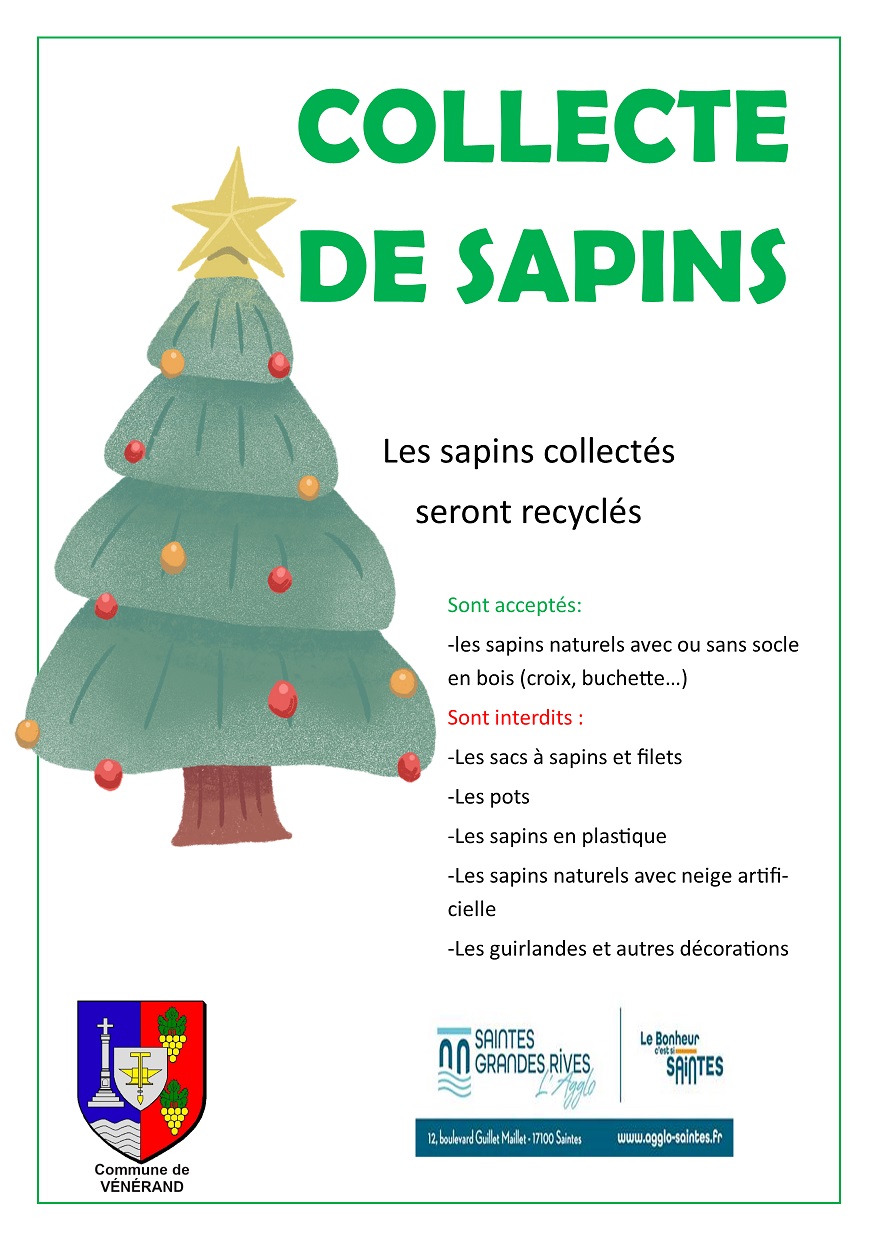 Vous pouvez déposer vos sapins à l’emplacement réservé sous le stade à côté du terrain de pétanque. Ils seront recyclés. Sont acceptés: -les sapins naturels avec ou sans socle en bois (croix, buchette…) Sont interdits : -Les sacs à sapins et filets -Les pots -Les sapins en plastique -Les sapins naturels avec neige artificielle -Les guirlandes et autres décorations