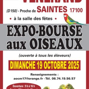 L’Amicale Ornithologique de la Charente-Maritime propose son expo-bourse aux oiseaux dans la salle municipale de Vénérand le 19 octobre 2025. Ouverte à tous les éleveurs. Ouverture public de 9h à 16h – Entrée 2€ (gratuit -12 ans) Renseignements: aocm17@orange.fr tel: 06.74.19.56.57
