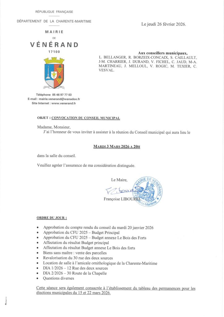 Les élus se retrouveront en séance publique le mardi 3 mars 2026 à 20h dans la salle du conseil en mairie.